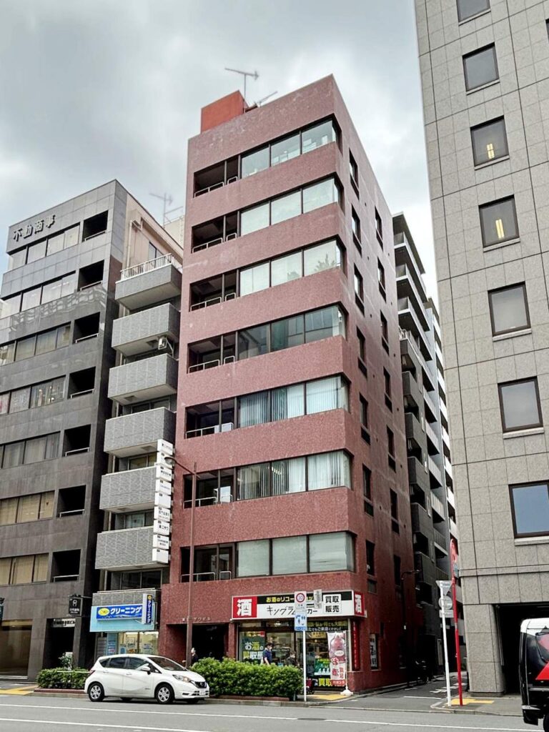 建物外観です。左側の入り口から入り、エレベーターで5階へお上がり下さい